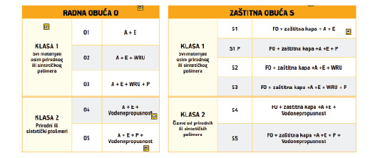 Radna obuća se obeležava sa O i u okviru ove kategorije imamo 5 nivoa: O1, O2, O3, O4 i O5. Zaštitna obuća se obeležava sa S i mora ispunjavati EN ISO 20345 standard. Postoji 6 podvrsta S1, S1P, S2, S3, S4i S5. Svaki sledeći nivo podrazumeva veći stepen zaštite.
